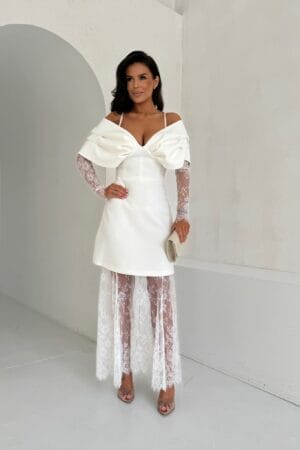 430,00 złSukienka z odpinanymi koronkowymi rękawami + koronkowa spódnica Ta sukienka to prawdziwa perełka dla kobiet, które kochają elegancję, nietuzinkowy design i możliwość zabawy modą. Dzięki odpinanym elementom możesz dowolnie zmieniać charakter stylizacji – od klasycznej i minimalistycznej po pełną glamour. Co zawiera sukienka? Sukienka mini – z głębokim dekoltem w kształcie litery V, pięknie podkreślająca…