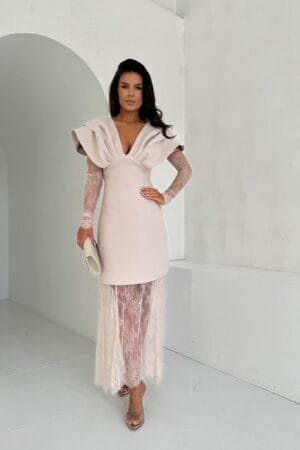 430,00 złElegancka sukienka w kolorze beżowo-pudrowego różu z odpinanymi koronkowymi rękawami + koronkowa spódnica w komplecie Szukasz sukienki, która wygląda luksusowo, jest niezwykle kobieca i daje Ci kilka możliwości stylizacji w jednej cenie? Właśnie ją znalazłaś. Ten model to połączenie klasy, nowoczesnej formy i romantycznej koronki. Beżowo-pudrowo róż jest ponadczasowy, subtelny i twarzowy – pięknie rozświetla…